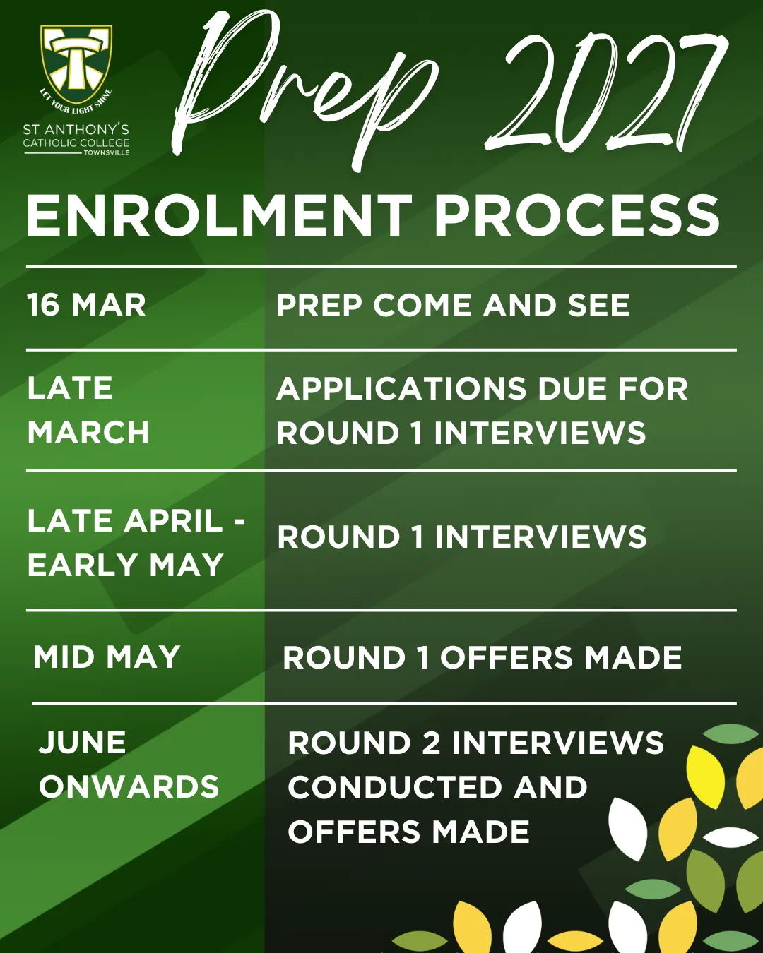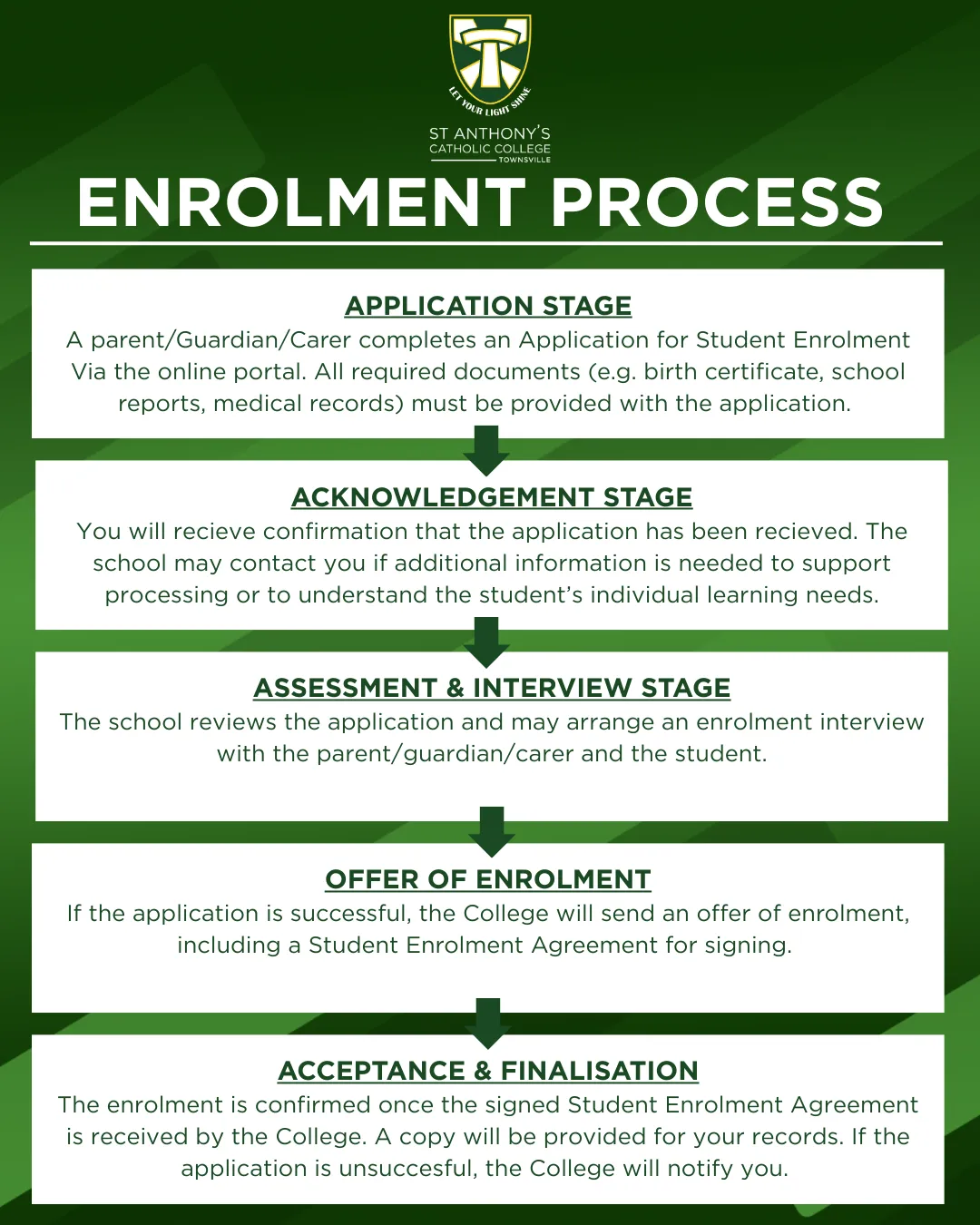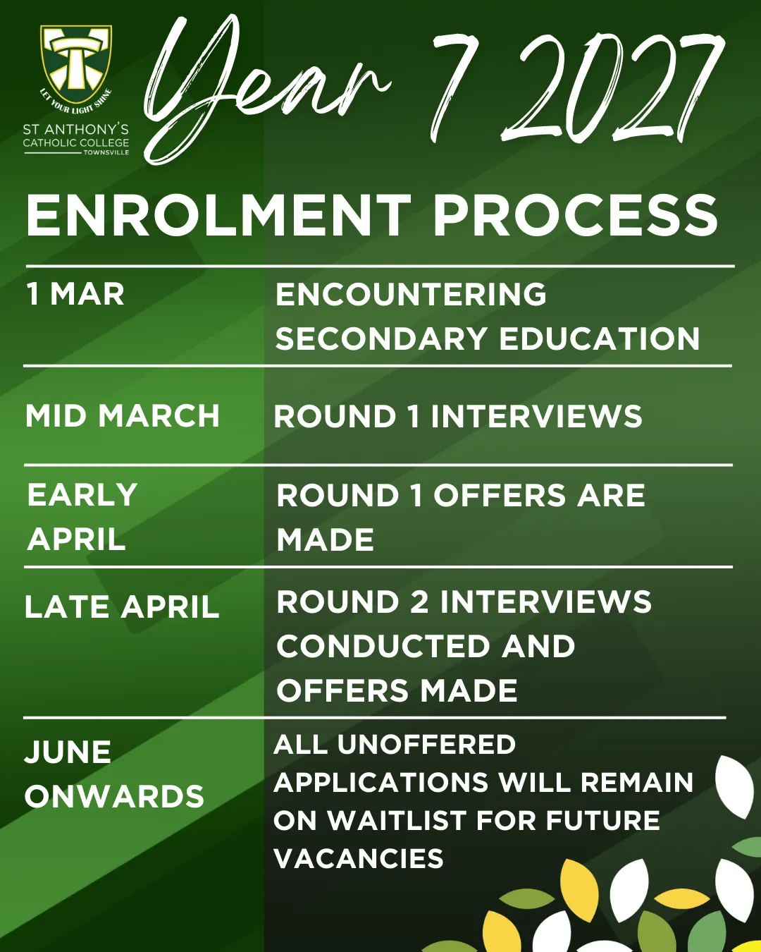 At St Anthony's Catholic College students usually join our community in Prep or Year 7, however places can become available in all years, and we encourage interested families to apply.